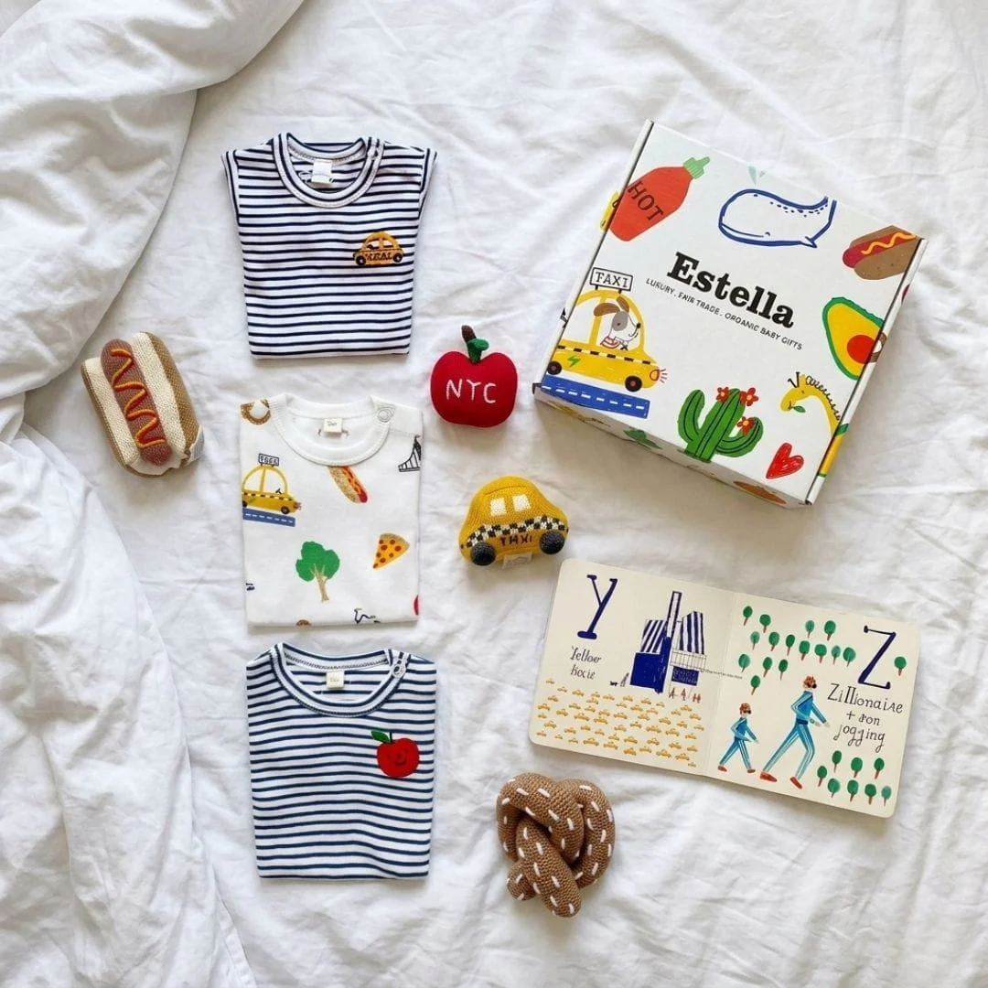 The ultimate NYC welcome for baby — three embroidered bodysuits, four hand-knit rattles, and a board book, arriving in a free gift box. NYC print bodysuit · taxi embroidered bodysuit · apple embroidered bodysuit · 4 hand-knit rattles · NYC ABCs book